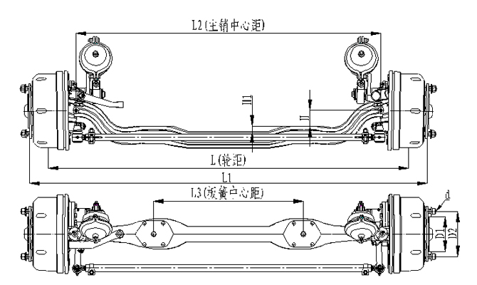 1.前軸為整體鍛造結(jié)構(gòu),采用加強(qiáng)設(shè)計,承載能力強(qiáng); 2.輪距、板簧距可靈活調(diào)整;3.車輪輪輞定位方式可采用球面定位或止口定位